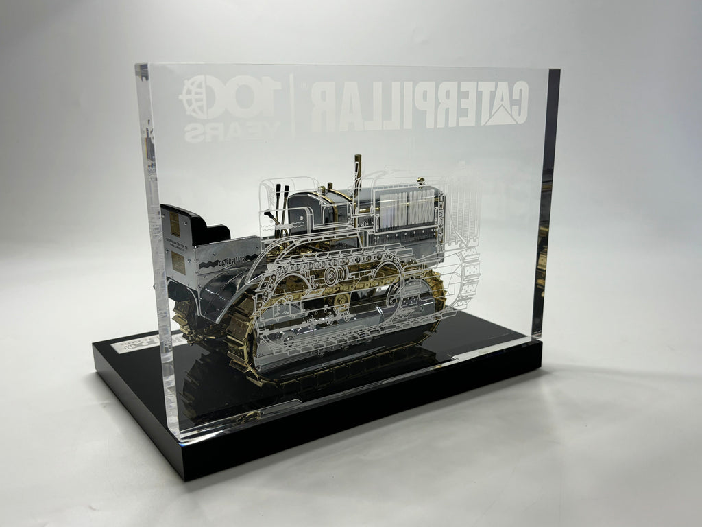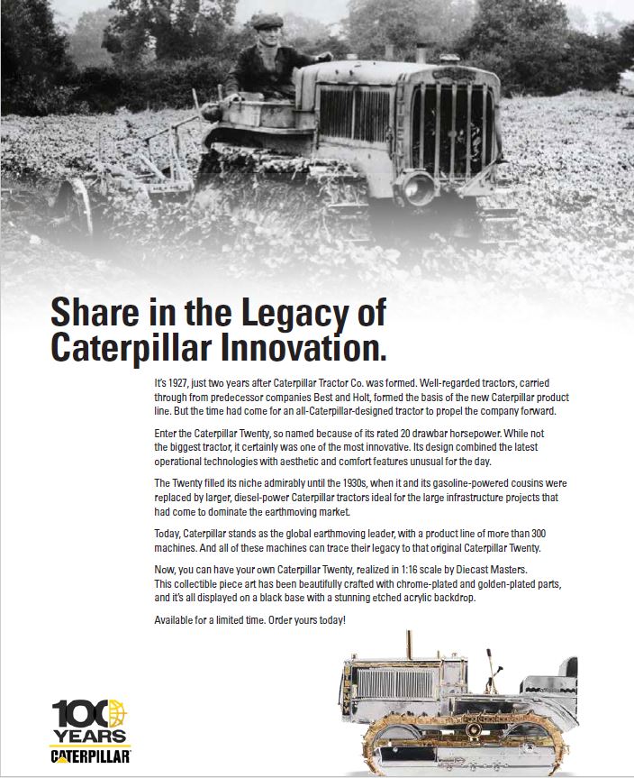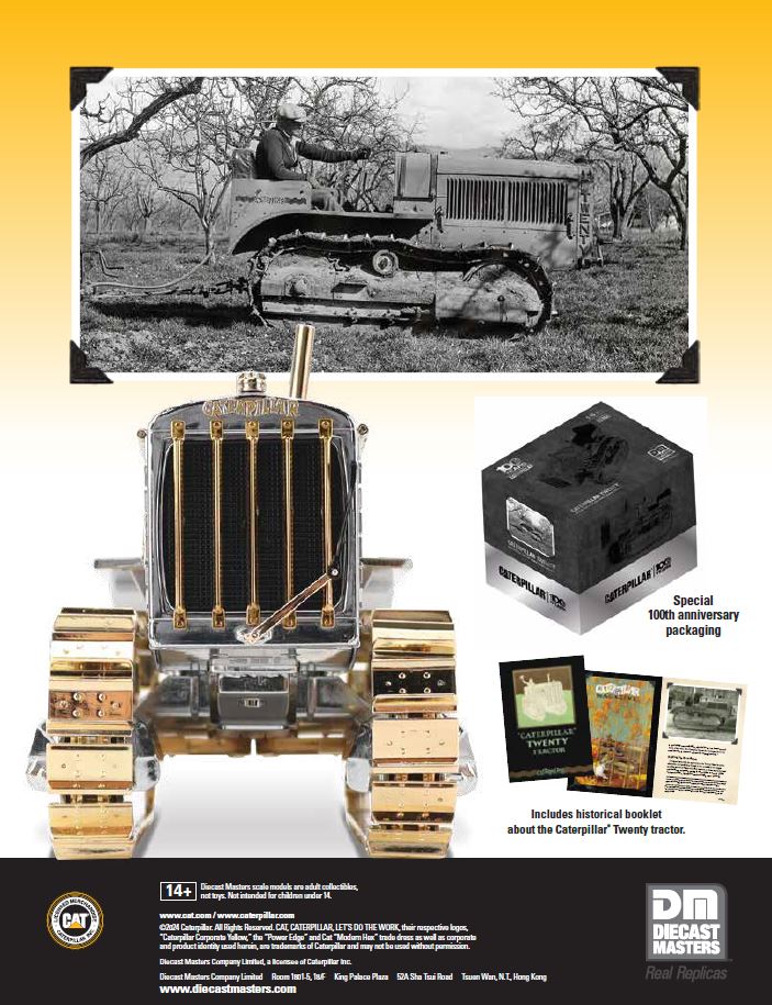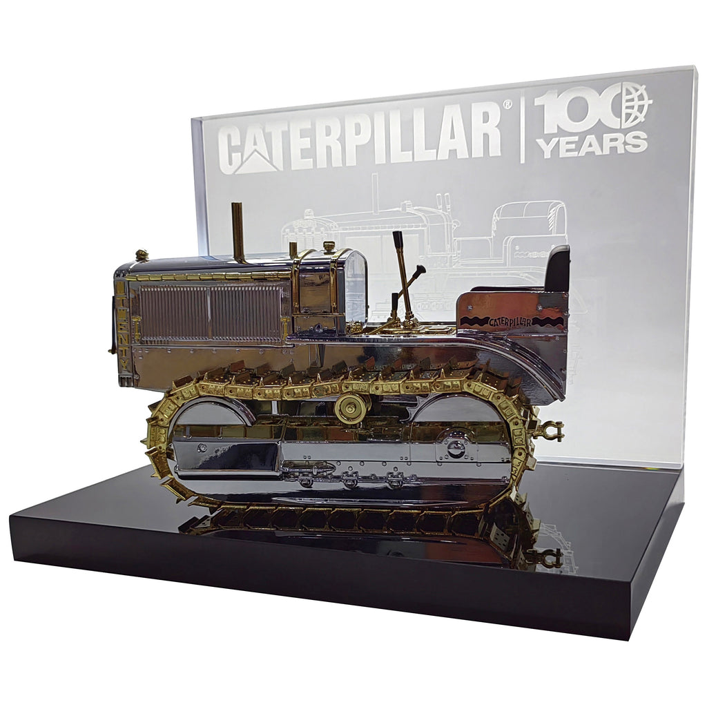Now, you can have your own Caterpillar Twenty, realized in 1:16 scale by Diecast Masters. This collectible piece art has been beautifully crafted with chrome-plated and golden-plated parts, and it’s all displayed on a black base with a stunning etched acrylic backdrop.