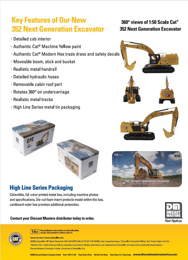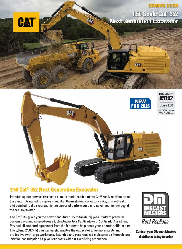 Introducing our newest 1:50 scale diecast model replica of the Cat®352 Next Generation Excavator. Designed to impress model enthusiasts and collectors alike, this authentic and detailed replica represents the powerful performance and advanced technology of the real excavator.