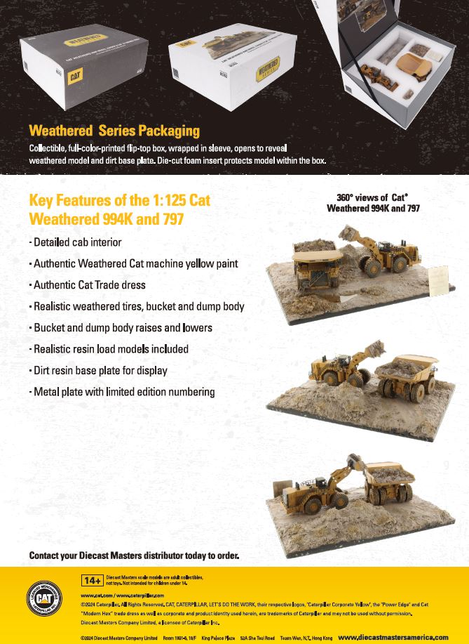 Taking the workhorse Cat 994K Wheel Loader and 797 Mining Truck and adding the realistic weathering of real working machines. The 994K is known for its versatile productivity in heavy construction, quarries, landfills and mines. The 797 offers best in class payload, superior braking and a tough rugged frame that delivers performance and long life no matter the conditions.